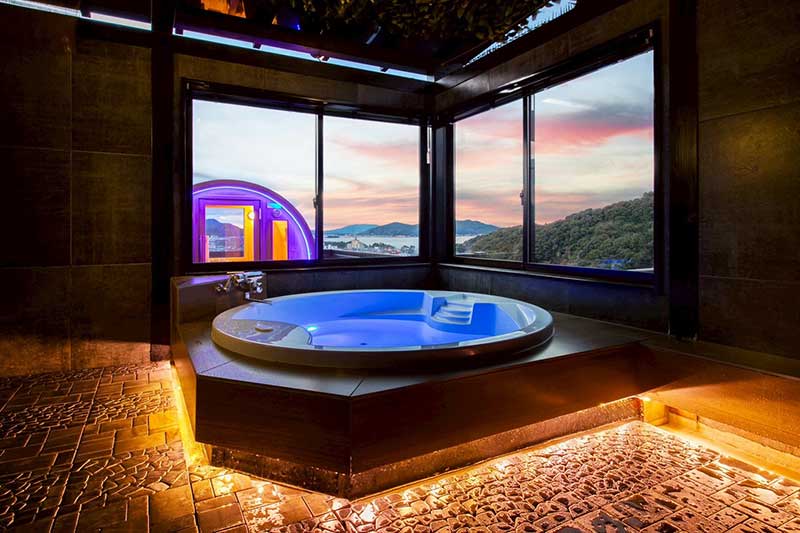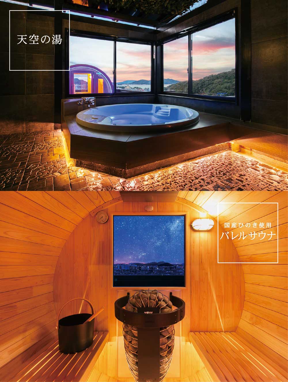 日中は海が見え、夜は福岡の夜景が楽しめる解放感抜群の「天空の湯」。